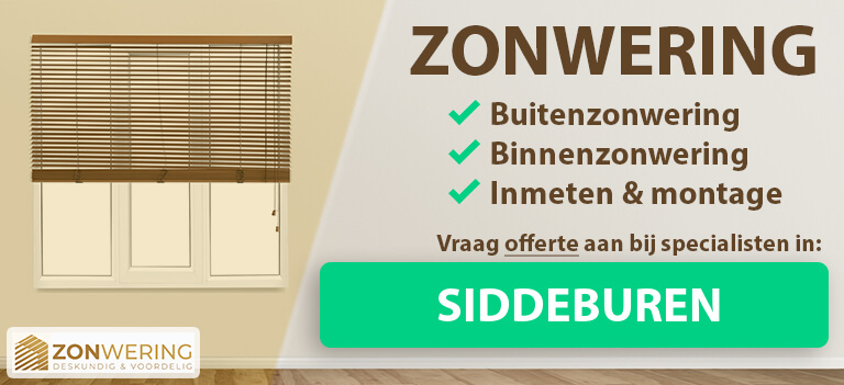 Zoek jij meer informatie over zonwering in Siddeburen? Zonwering kan je voor binnen en buiten de woning kopen. Het is er al vanaf €50,00. Degelijke buitenzonwering zoals een markies is ideaal om de zon en warmte te weren. Ook creëert een zonnescherm een aanzienlijke hoeveelheid schaduw op jouw terras. Binnenzonwering als o.a. gordijnen of lamellen is meestal een stuk goedkoper en kan je helemaal aanpassen op jouw stijl. Er bestaan ontzettend veel diverse soorten. Via zonweringaanbiedingen.nl verstrekken we een uitgebreide keuzehulp waar we alle mogelijkheden bespreken. Ook bekijk je een indicatie van de kosten en contactgegevens van diverse zonwering specialisten in Siddeburen en de omliggende regio.