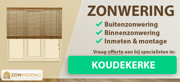 Ben je op zoek naar zonwering in Koudekerke? Zonwering is beschikbaar voor buiten en binnen. De prijzen beginnen vanaf €67,50. Buitenzonwering zoals een screen is zeer handig om de zon buitenshuis te houden. Daarbij biedt een zonnescherm plekjes met schaduw om lekker te eten. Binnenzonwering als bijv. gordijnen of jaloezieën is meestal een stuk goedkoper en is een prima aanvulling op jouw interieur. Er zijn tientallen afzonderlijke producten. Op dit platform geven we een gratis keuzegids dat zorgt dat je goed voorbereid een offerte kan aanvragen. In aanvulling daarop verstrekken we een indicatie van de kosten en een lijst met erkende zonwering specialisten in Koudekerke en omgeving.
